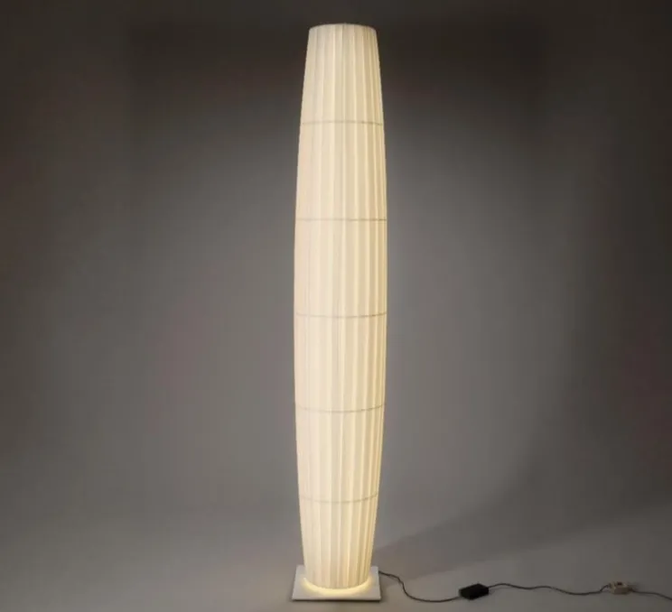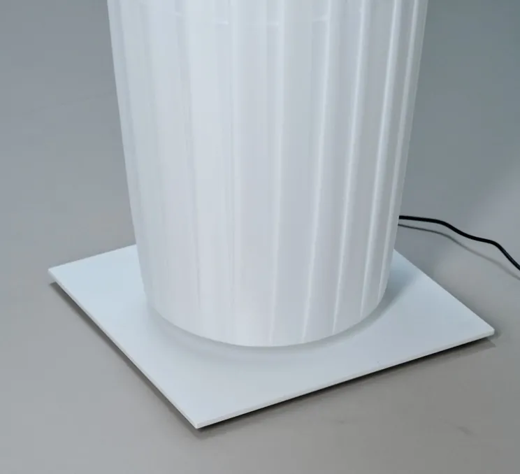 Ce lampadaire se compose d’une structure ovoïde, habilement conçue à partir de rubans enroulés qui créent un jeu de lumière subtil et délicat. L’ensemble repose sur une base carrée en acier brillant. Sa légèreté et sa finesse en font un élément décoratif aussi élégant que fonctionnel. À la fois décorative et minimaliste, sa géométrie simple habille l’espace.