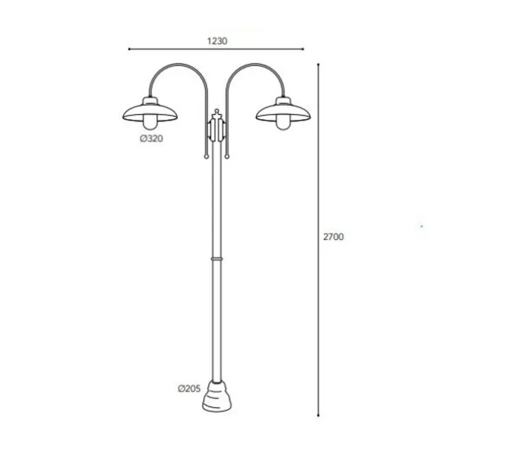 Le lampadaire mesure 2,70m de haut, 1,23 m de profondeur et 32 cm de diamètre pour l’abat-jour. Le diamètre du pied mesure 20,5cm.