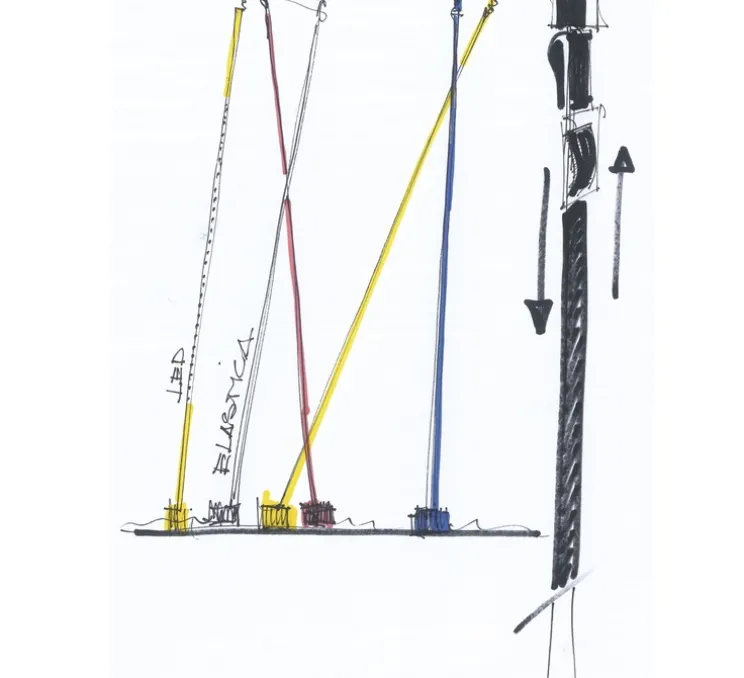 On découvre alors un luminaire d’une grande finesse, dont l’élasticité de la source lumineuse et du textile utilisé permettent de tracer une ligne entre le sol et le plafond. Elastica est composé d’une bande de tissu élastique dans laquelle une bande LED flexible a été sur toute sa longueur. Pour maintenir le luminaire tendu, l’extrémité supérieure est à fixer au plafond tandis qu’un contrepoids permet de relier la structure au sol et de la stabiliser. Caractéristique de la culture du Studio Habits, une véritable interaction se créée entre le luminaire et l’utilisateur.