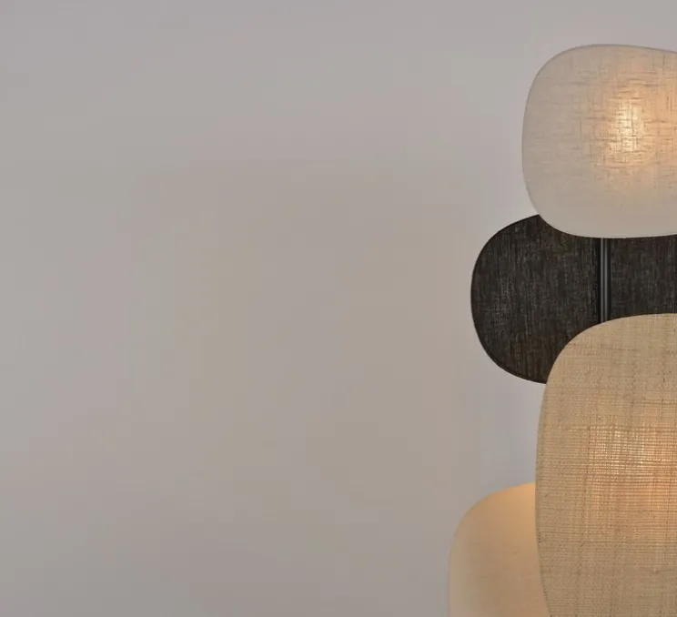 Le lampadaire comprend une structure en métal peint ainsi qu’un abat-jour composé de 5 écrans de couleur lin et noir.