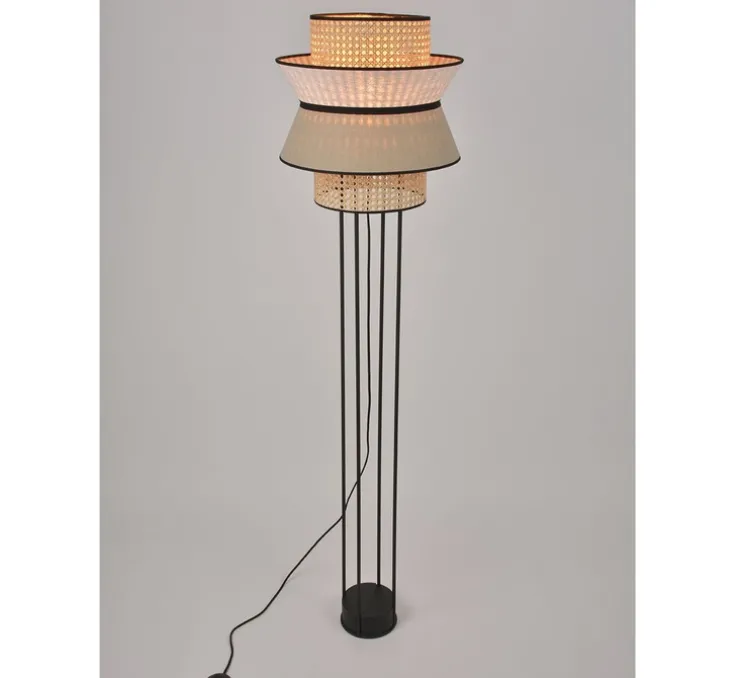 Le lampadaire en métal peint finition sablée, est composé d’un abat-jour en lin lavé et cannage. Il est équipé d’un cordon textile et d’un interrupteur au pied.