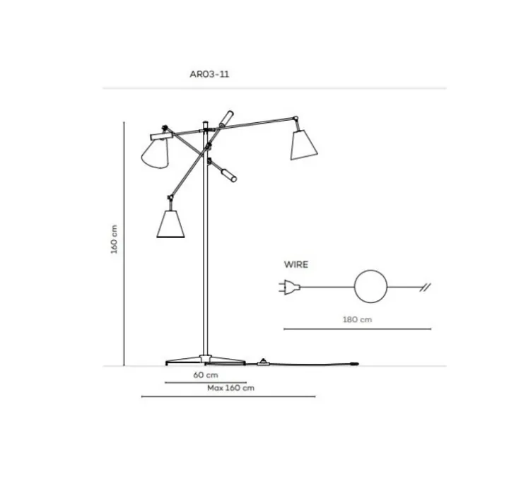 Le lampadaire Triennale mesure 160cm de hauteur et 160cm de hauteur. Les 3 ampoules LED E27 sont incluses avec une puissance de 7W chacune, 2700K et une intensité lumineuse de 3*806lm. Les ampoules peuvent être changées, privilégiez des ampoules E27 avec une puissance maximale de 15W. Non variable. Le câble avec interrupteur est inclus et mesure 1,8m. Les abat-jour possèdent une panoplie de combinaison de couleurs différentes (cf.fiche technique)