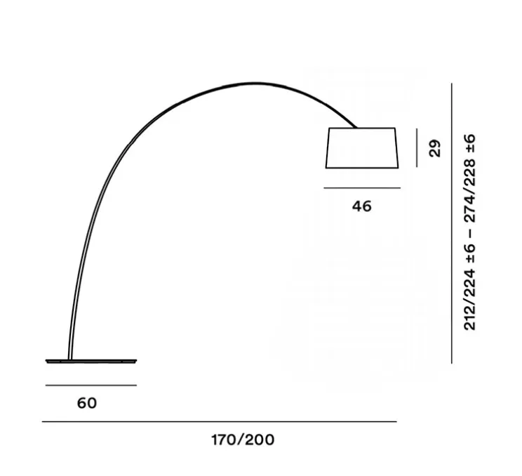 La source est incluse (1x LED, 28W, 2700K, 3840lm, CRI>90). Le câble transparent présente un variateur servant d’interrupteur on/off tout en permettant de régler l’intensité lumineuse. Le luminaire vient avec quatre contrepoids à insérer dans le logement prévu à cet effet au-dessus du diffuseur pour en réguler la hauteur. Des tiges supplémentaires sont disponibles pour allonger l’arc (accessoire à acheter séparément).