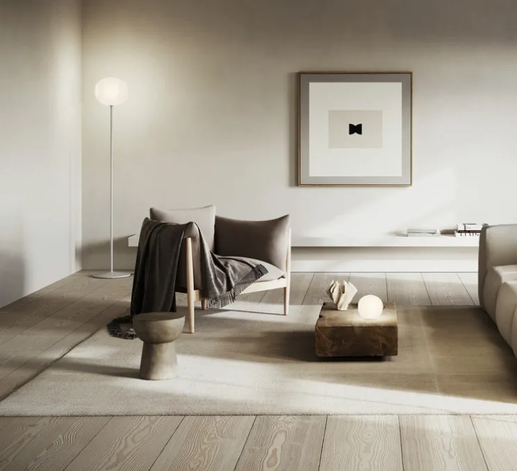 Le lampadaire Volum, disponible en version short et long, ainsi qu’en deux tailles de diffuseur (29 ou 42 cm), se distingue par sa sobriété et son caractère intemporel.