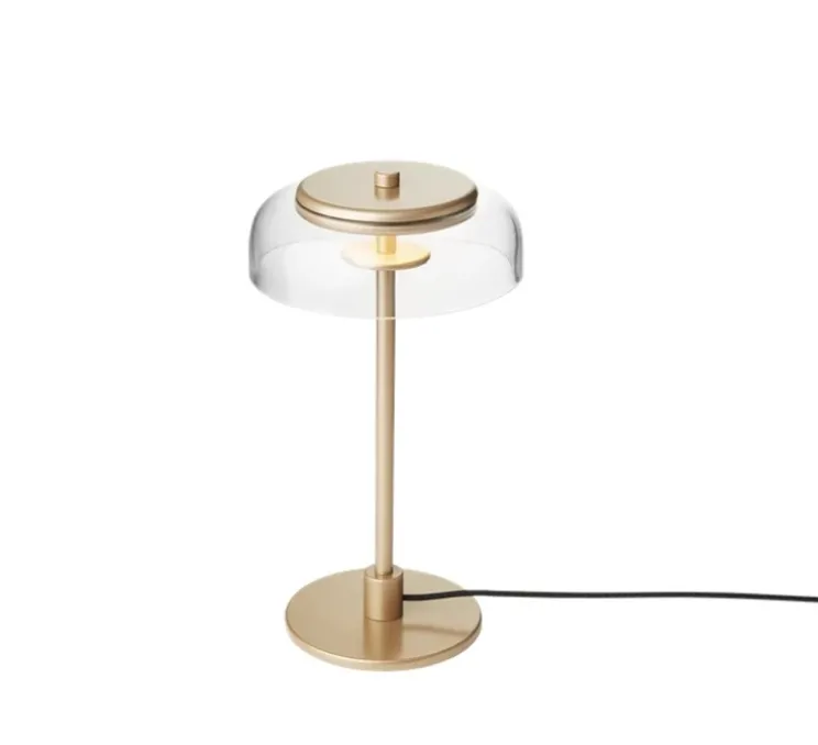 La lampe est équipée d’un module LED remplaçable soigneusement intégré, qui projette la lumière vers le haut dans un disque métallique doré. Cette caractéristique crée une lueur chaleureuse et enveloppante qui illumine l’abat-jour en verre transparent. Le contraste entre le métal doré et le verre transparent ajoute une touche d’élégance à la lampe.