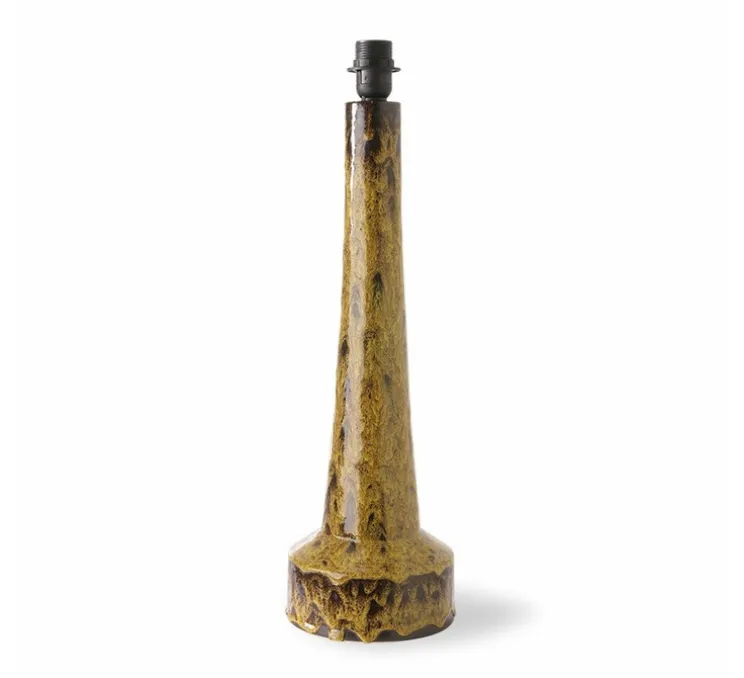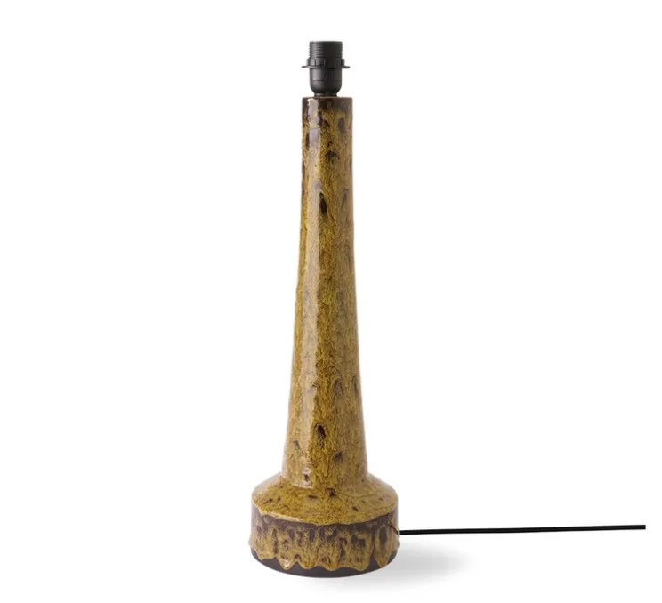 La base Retro Stoneware moutarde mesure 62cm de hauteur et 17cm de diamètre. L’abat-jour Cone marron mesure 58cm de hauteur et 36cm de diamètre. La source lumineuse n’est pas incluse, cette lampe nécessite une ampoule E27, max 60W. Le câble avec interrupteur est inclus.