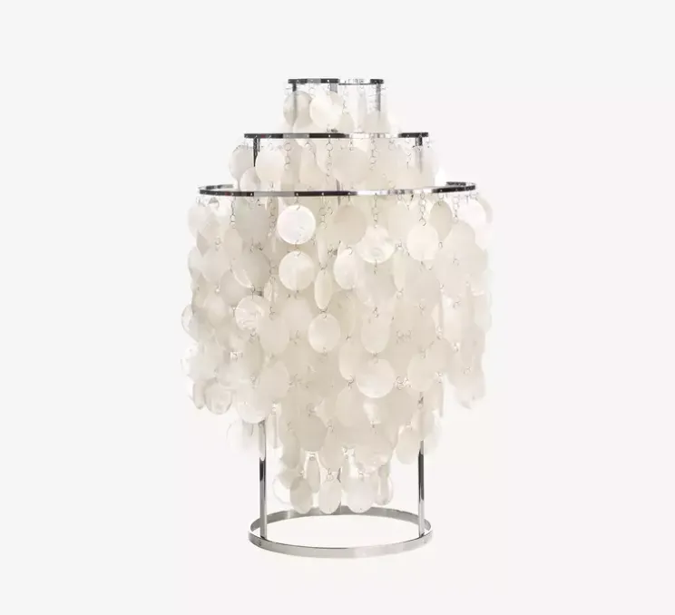 La série de luminaires Fun traduit l’enthousiasme du célèbre designer danois. Avec la Fun 1TM, Panton met en scène une lampe audacieuse créée pour être vue et entendue. Le doux bruit des pastilles qui s’entrechoquent entre elles, crée ainsi une atmosphère chaleureuse grâce à la nacre presque translucide. Les pastilles de nacres sont suspendues sur un cadre métallique à deux anneaux en métal, ce qui crée un jeu de lumière surprenant une fois allumée.
