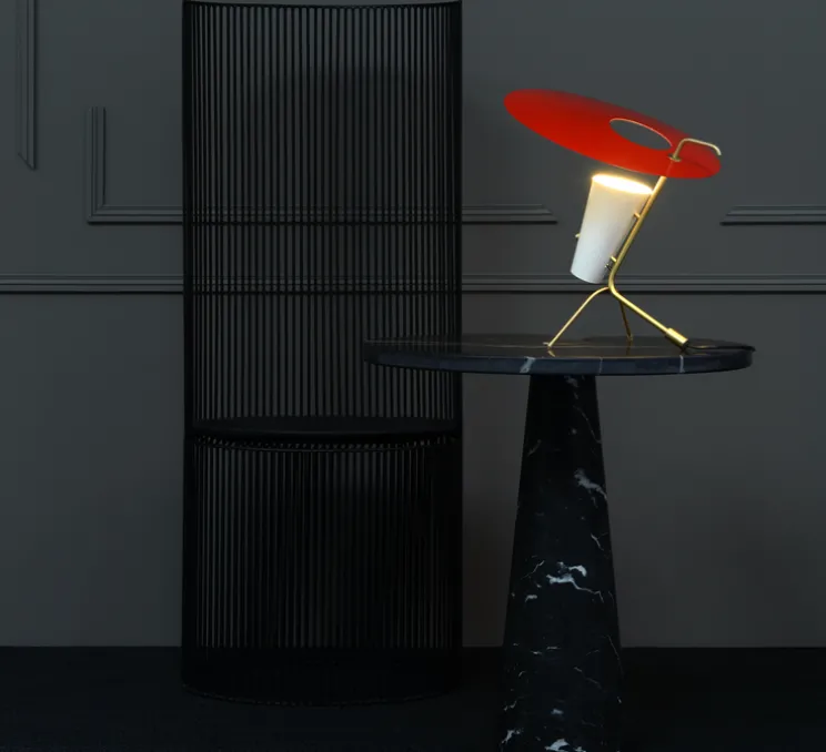 Voici la célèbre lampe à poser G24 de coloris rouge. Un dessin qui vient tout droit du légendaire designer Pierre Guariche en 1953. Elle est aujourd’hui rééditée par la maison française Sammode dans les mêmes proportions et matériaux que dans les années 50 excepté quelques visses plus solides aujourd’hui.