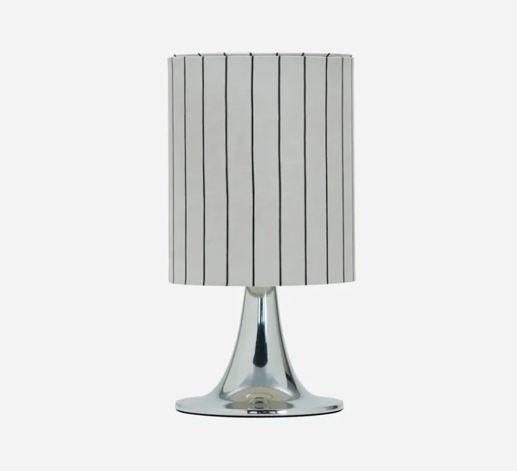 Cette lampe arbore une base argentée en forme de tulipe, un clin d’œil aux styles classiques, tandis que son abat-jour blanc rehaussé de subtiles rayures blanches et noires ajoute un caractère audacieux à votre décoration. Parfaite pour les intérieurs de style scandinave, elle trouve sa place sur une table d’appoint, un bureau ou une console, où elle ajoute une note à la fois décorative et fonctionnelle.