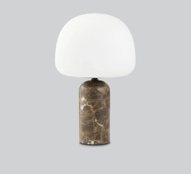 Le design de la lampe Kin s’articule autour d’un abat-jour surdimensionné en verre opale mat, soufflé à la bouche. Cette caractéristique distinctive confère à la lampe une esthétique unique, évoquant l’élégance des figurines de collection. L’abat-jour repose gracieusement sur un socle en marbre Emperador poli, qui présente des courbes douces et harmonieuses. Cette combinaison de verre et de marbre crée un contraste visuel saisissant, faisant de la lampe Kin une pièce contemporaine et harmonieuse.