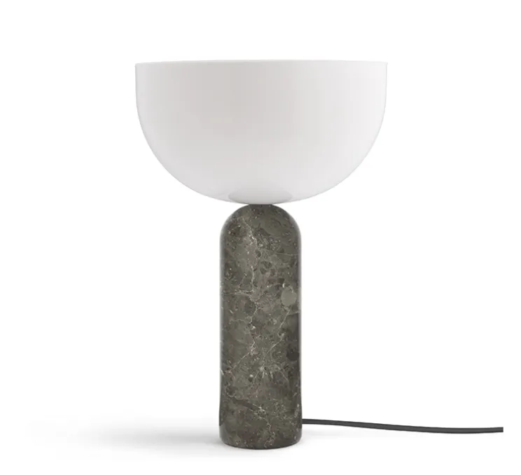 La lampe de table Kizu est disponible en deux tailles et en trois finitions de marbre : blanc, noir ou Gris du Marais.