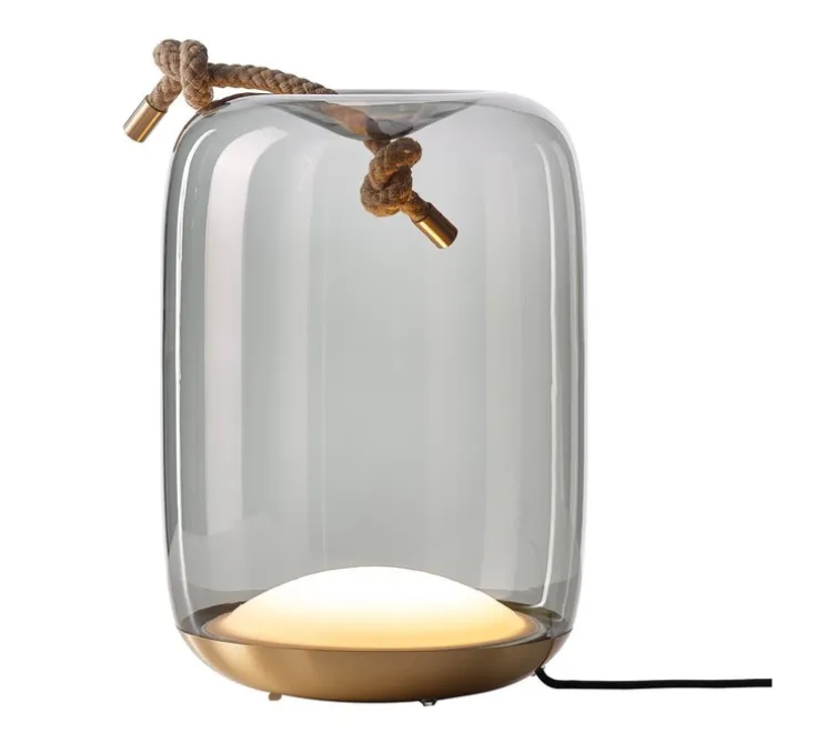 Les designers Chiaramonte et Marin dévoile leur collection Knot lampe à poser, dont la lampe Cilindro table en verre gris fumée, Laiton, éditée par Brokis.