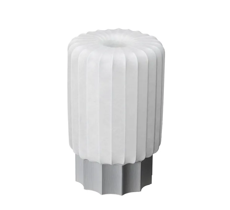 Meter existe en deux tailles : Un mètre et un demi-mètre. La base en forme de colonne est fabriquée en aluminium non peint et l’abat-jour est constitué d’une structure en fil de fer recouverte d’un matériau cocon fabriqué à la main. La source lumineuse est au même niveau que la base, ce qui crée un effet de lumière douce et chaleureuse.