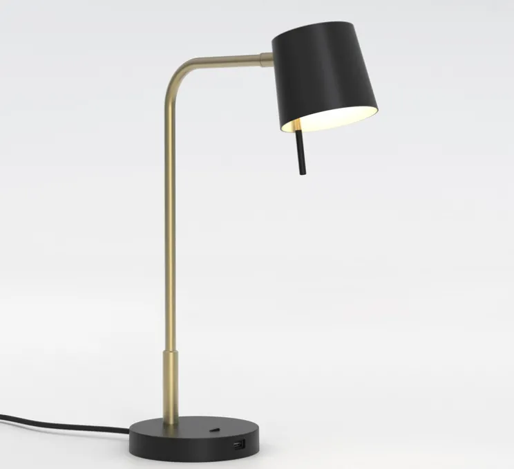 Découvrez la lampe à poser Miura Desk USB, avec sa base en or mat et abat-jour Cone 105 noir mat, de la maison britannique Astro Lighting.