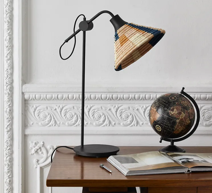 Parrot se compose d’un corps en métal noir et d’un abat-jour pivotable tissé de fil d’abaca. Prenant ses inspirations dans l’art ancestral qu’est la vannerie et dans des camaïeux issus de paysages, la lampe à poser Parrot se place dans chaque intérieur, dans une entrée, une chambre ou un salon.