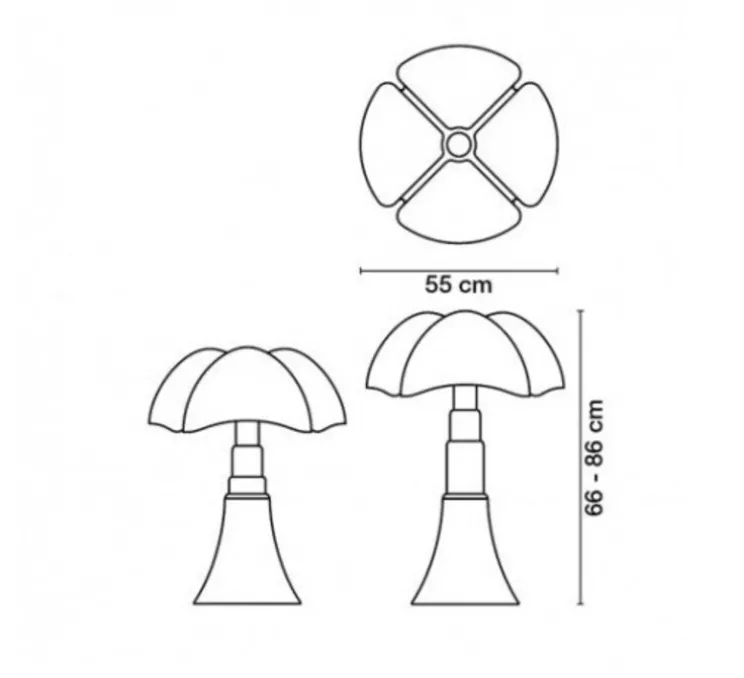 La forme de la base évasée a été inspirée des ailes d’une chauve-souris (« pipistrello » en italien). Le diffuseur de cette lampe propage une lumière douce et intense avec une ampoule LED.