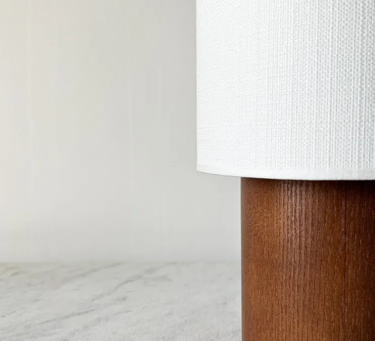 Le pied de lampe Simone est en bois de hêtre teinté noyer et son abat-jour est en lin blanc. Simone mesure 33cm de hauteur et 18cm de diamètre.