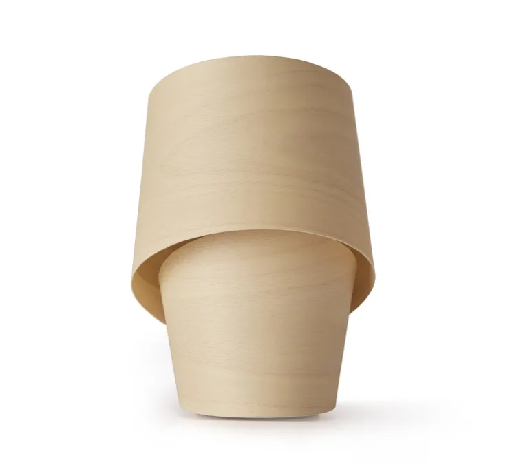 Reconnue pour ses créations en feuille de bois, ce luminaire reprend les codes de la marque en proposant un design chaleureux et tout en rondeur. La lampe est fabriquée d’une seule feuille de bois, enroulée autour de la source lumineuse comme un cocon. Le bois est associé au métal noir de la poignée, pour créer un contraste intéressant dans le design.