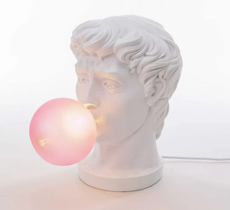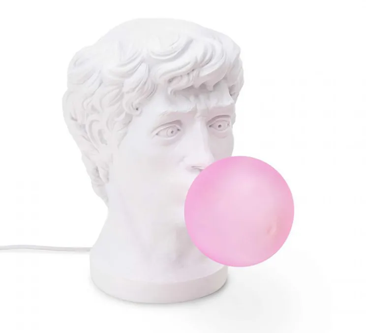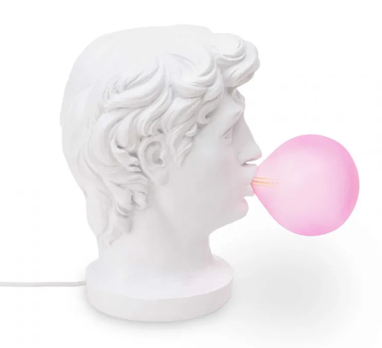 Wonder est la représentation d’une tête de statue grecque classique, soufflant une énorme bulle de chewing-gum et ne sachant pas quoi en faire. Décalé et drôle, ce luminaire est le détail amusant parfait dans une chambre ou dans un salon.