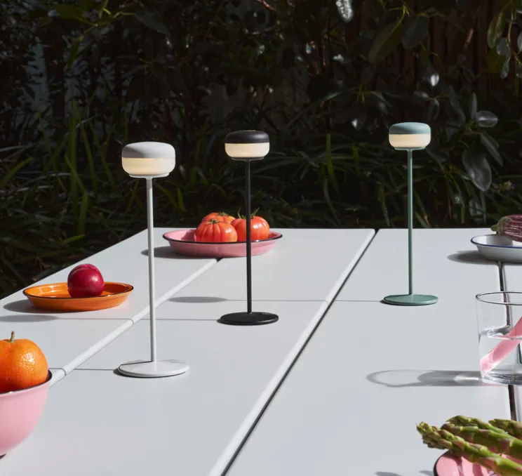 Retrouvez la lampe baladeuse Cheerio dans une teinte « sauge », produite par la marque néerlandaise Fatboy.