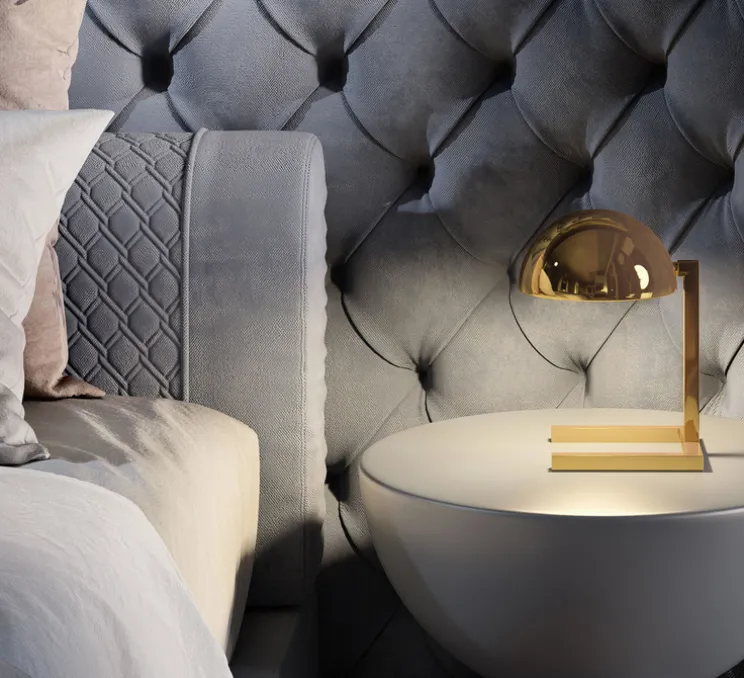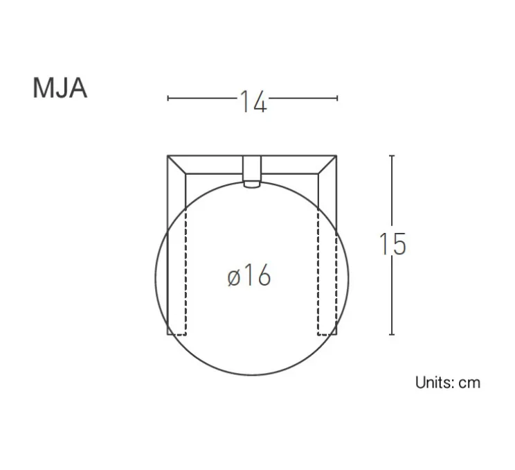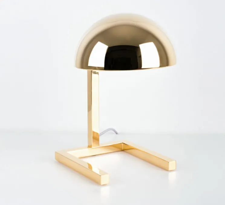 La lampe MJA est en laiton avec une finition or, elle se compose d’une calotte appuyée sur une structure quadrangulaire qui sert de base.