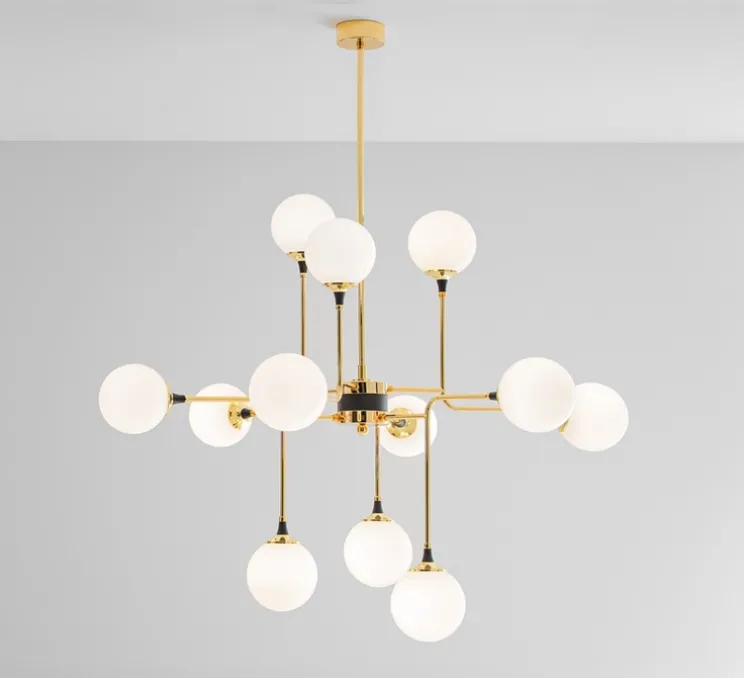 Ce lustre incarne l’essence du design rétro-chic. Issu de la collection éponyme, ce luminaire évoque les années 1950 avec son mariage subtil entre le laiton et le verre opalin. Chaque détail, de la dorure galvanique de la structure aux sphères en verre soufflé triplex blanc, reflète un raffinement intemporel.