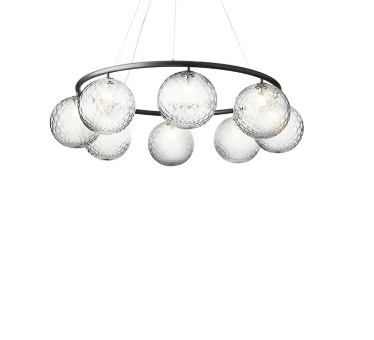 Ce fabuleux lustre aux formes pures nous dévoile huit sphères en verre soufflé transparent suspendues par des fils et d’un anneau en métal laqué de couleur noir au travers desquelles la lumière se diffuse gracieusement.