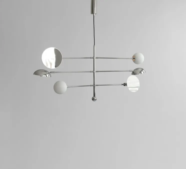 Composé de trois abat-jour distincts en métal et verre, Sahn joue sur les contrastes et les reflets du chrome pour créer une atmosphère lumineuse sophistiquée. Chaque bras orientable permet d’ajuster l’éclairage selon l’espace et l’ambiance recherchée. Idéal au-dessus d’une table à manger ou dans un salon, ce lustre devient un élément central de décoration tout en apportant une touche rétro-futuriste à votre intérieur.