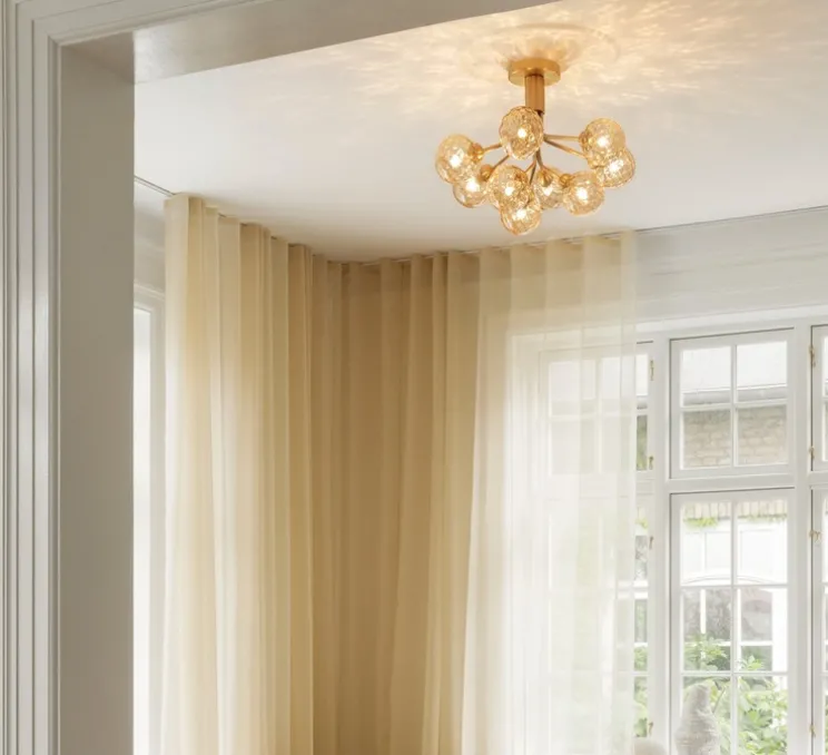 Le plafonnier Apiales diffuse une lumière douce, chaleureuse et très éclairante, il trouve aisément sa place dans une salle à manger, un hall ou une chambre et est conçu en finition laiton brossé. Ses neuf globes soufflés à la bouche sont en verre transparent.