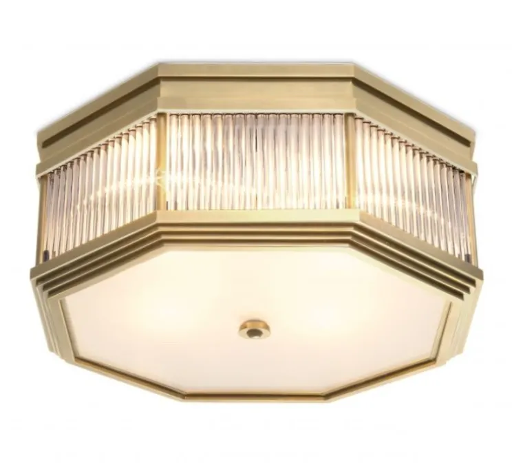 Ce plafonnier est composé de tiges de verre transparent placées dans les panneaux latéraux du cadre octogonal pour créer un effet étincelant. Le diffuseur en verre dépoli dissimule subtilement les ampoules et permet de créer une atmosphère apaisante et confortable.