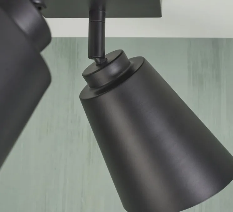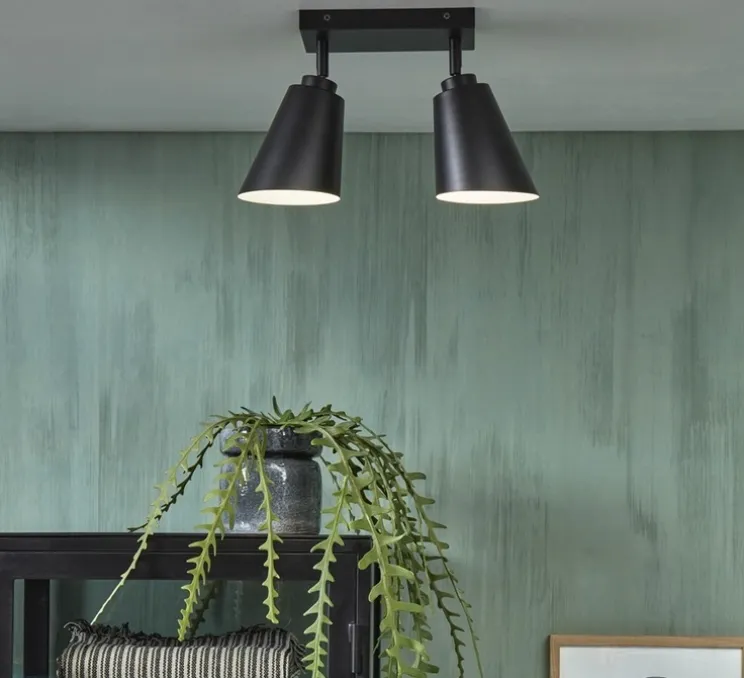 Ce plafonnier composé de deux abat-jour coniques orientables, en finition noire permet d’apporter du caractère à votre intérieur.