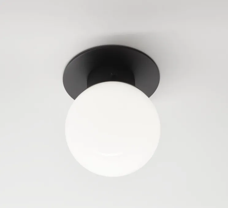 Il se compose d’un verre opalescent sphérique, promettant une répartition douce et égale de la lumière et ainsi une atmosphère harmonieuse et agréable dans la pièce. La base présente quant à elle une finition noir mat.
