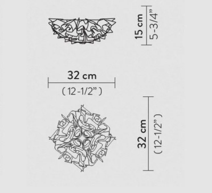 Ses dimensions sont de 32 cm de diamètre et de 15 cm de hauteur. Nous vous recommandons deux ampoules LED E14 de 6 W Max.