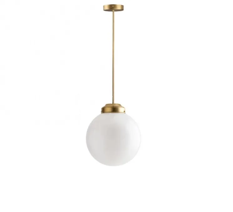 Cette applique, au design industriel et minimaliste, est composé d’une structure en laiton brossé et d’un globe sphérique en verre opalin. Chaque globe est fabriqué à la main par des souffleurs de verre qualifiés à l’aide d’une sarbacane en métal et d’un moule en fer.