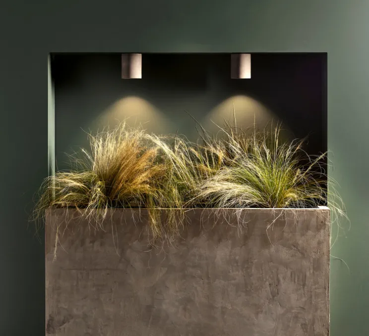 Kos Round mesure 14,1 cm de hauteur et 11 cm de diamètre. L’ampoule Led GU10 dimmable d’une puissance maximale de 6W n’est pas fournie mais est recommandée pour le bon fonctionnement du luminaire. Variable en Casambi et compatible avec l’option « Smart Lighting » grâce aux accessoires Casambi. Driver non requis. Montage au plafond.