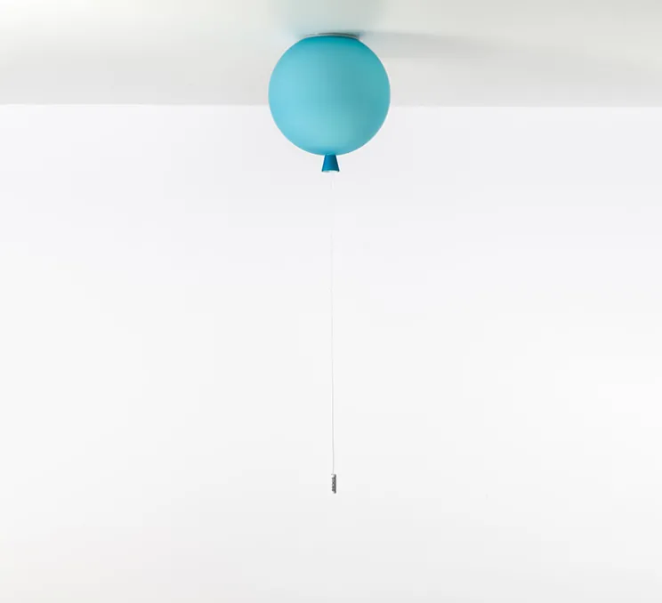Le luminaire Memory est composé d’un abat-jour en verre soufflé turquoise mat en forme de ballon de baudruche équipé d’une ficelle blanche, se montant au plafond grâce à une plaque de métal qui devient invisible après installation. Poétique et ludique, le plafonnier Memory s’installe dans chaque espace intérieur, que ce soit dans une chambre, une entrée ou un espace de jeu.