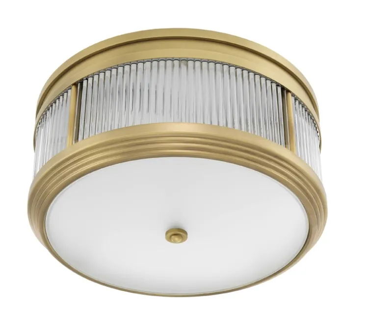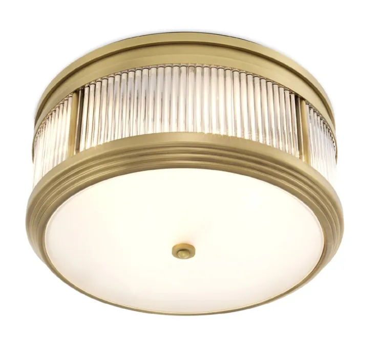 Inspiré du design contemporain Art déco, le plafonnier Rousseau séduit par son charme et sa délicatesse. Ce plafonnier rond est fait en verre transparent dépoli, et il dispose d’une finition laiton antique.