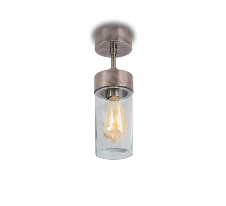 Sa forme cylindrique et sa finition en antique nickel et verre transparent lui confèrent une allure industrielle sobre et affirmée. Son design compact s’intègre facilement sous un auvent, dans une entrée ou sur une terrasse couverte. Le verre transparent valorise la source lumineuse et diffuse une lumière directe qui structure l’espace. Pour un rendu harmonieux, il s’associe aisément à des matériaux bruts comme le bois ou la pierre.