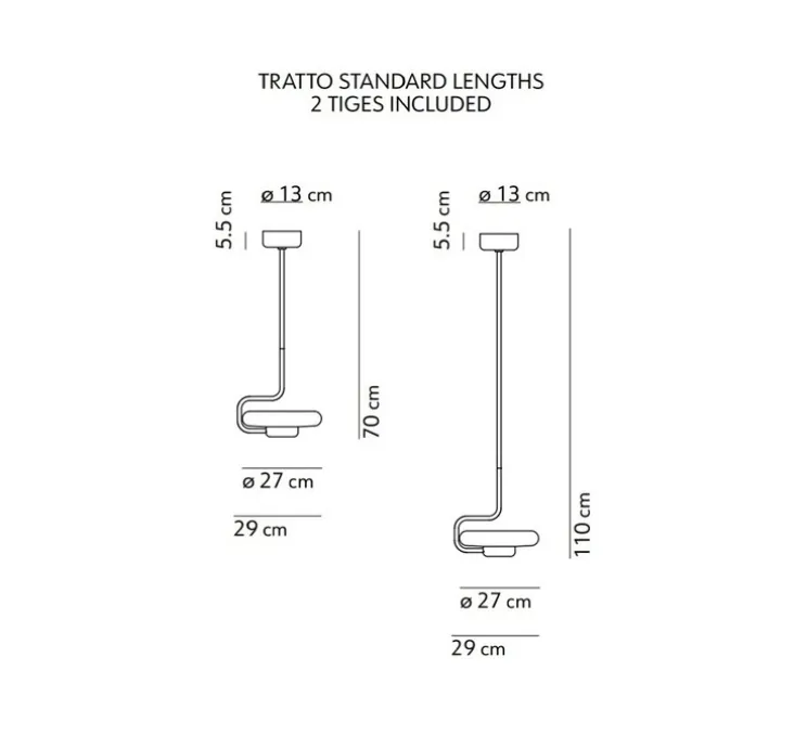Tratto intègre un module LED dimmable émettant une lumière douce à 2700K, avec une puissance de 1450 lumens et un excellent rendu des couleurs (IRC >90). Il diffuse une lumière fixe à 360°, idéale pour un éclairage décoratif et homogène. Le luminaire mesure 27 cm de long et s’installe en plafonnier avec une hauteur ajustable selon la tige choisie.