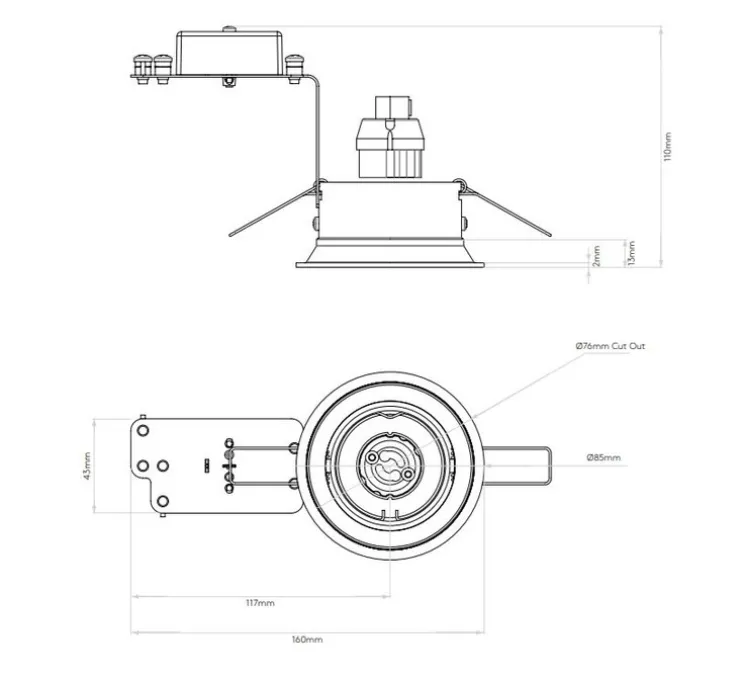 Son diamètre et sa hauteur mesurent respectivement 8.5 et 11.5cm. Une hauteur de 15cm est requise pour le faux plafond.