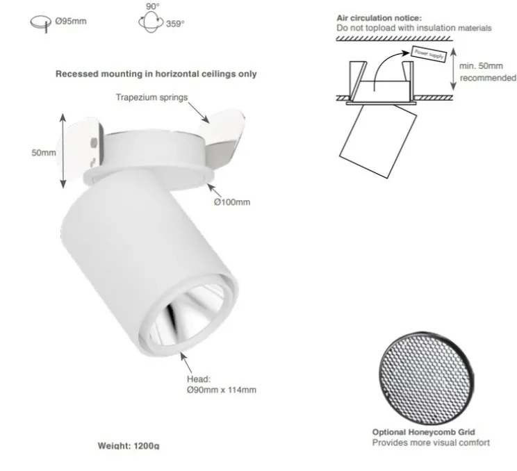 L’éclairage LED intégré du spot semi-encastré Atlas est de grand qualité avec son IRC de 90. Il est également puissant, dégageant 2112lm et une colorimétrie de 3000K, un blanc chaud.