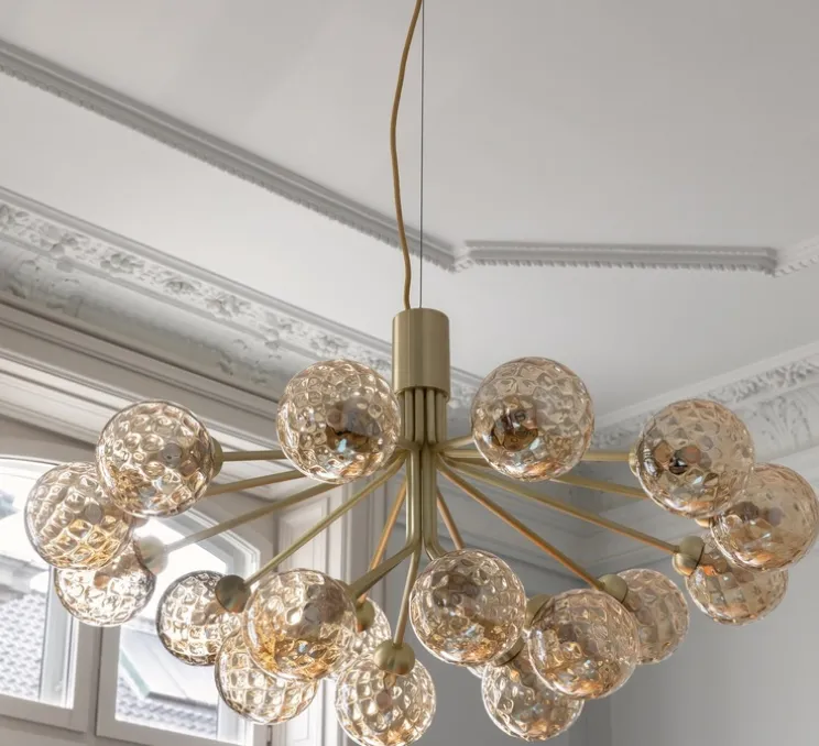 La collection Apiales comprend des lustres et un plafonnier de neuf ou dix-huit globes en verre soufflé à la bouche.