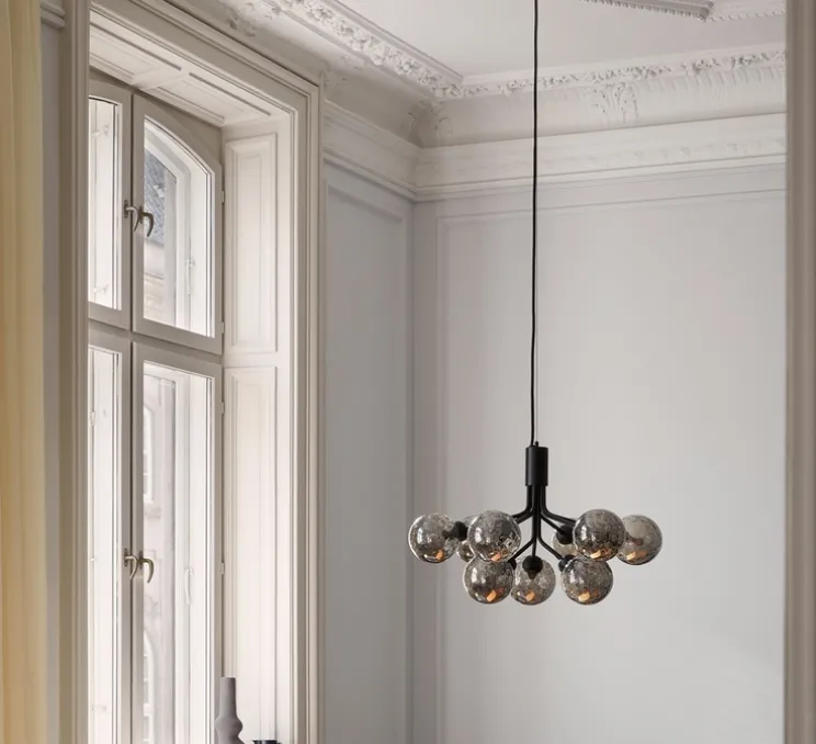 Sofie Refer s’est inspirée de la nature scandinave, les 9 bras de la suspension Apiales rappellent les tiges d’un bouquet d’où la lumière se diffuse gracieusement au travers des globes opalins en verre soufflés à la bouche.