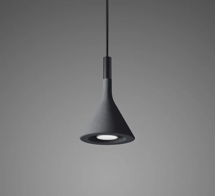 Faites entrer un objet à la fois brutaliste et design pour éclairer votre intérieur ! Cette suspension en béton brut Aplomb Mini de coloris anthracite est signée du duo de designer Lucidi et Pevere est éditée par la maison italienne Foscarini en 2022.