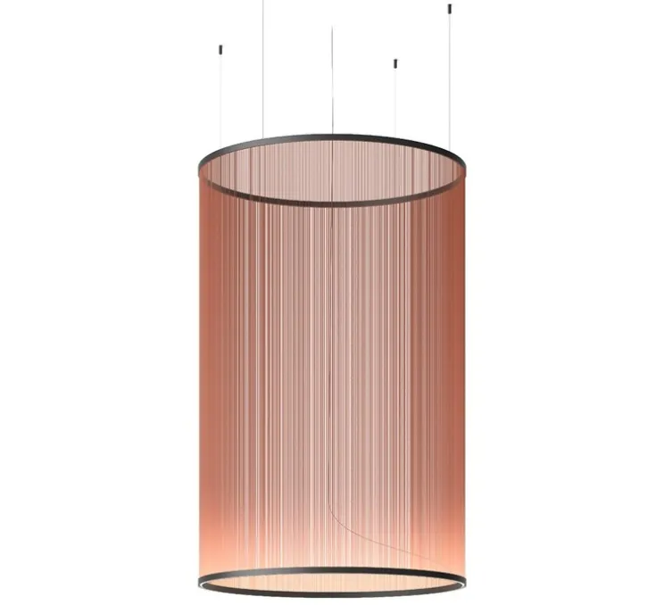 Esthétiquement, l’Array se présente sous la forme d’un cylindre imposant d’un diamètre de 124 cm et d’une hauteur de 193 cm. La combinaison de l’aluminium et du laiton confère au luminaire une esthétique raffinée, ajoutant une touche de sophistication à tout intérieur. L’Array n’est pas simplement un luminaire, mais une œuvre d’art suspendue qui crée une atmosphère visuelle captivante grâce à un abat-jour tissé de fils beiges. Installé au-dessus d’une table à manger ou dans un espace de réception, ce lustre impressionne par sa présence imposante et sa lumière diffuse à 360 degrés.
