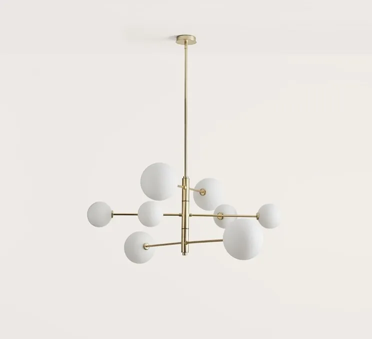 Elle se distingue par sa structure linéaire traversée de quatre bras métalliques chacun surmonté d’un diffuseur en verre opalin ou transparent, évoquant une constellation organisée avec une grande finesse. Son design rigoureux et organique rend hommage aux formes scientifiques, tout en conservant une élégance poétique unique.
