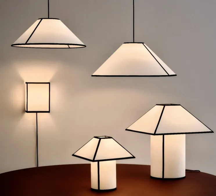 Son abat-jour semi-translucide, fabriqué à partir d’ECOPET (un matériau issu de plastique PET recyclé) évoque la texture du papier tout en diffusant une lumière douce et chaleureuse. Soulignée par un liseré textile contrastant, cette suspension incarne l’équilibre entre graphisme et style japandi.