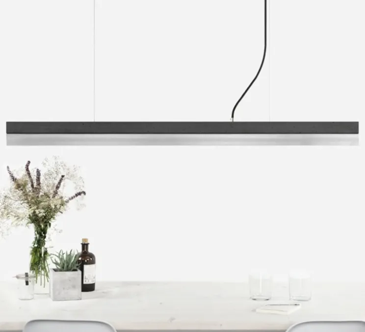 Grâce à sa grande taille, la lampe convient parfaitement au-dessus d’une longue table à manger, un buffet ou un bureau. Grâce à son design minimaliste et à ses matériaux contrastés – béton et acier, la lampe design peut être combinée avec n’importe quel style.