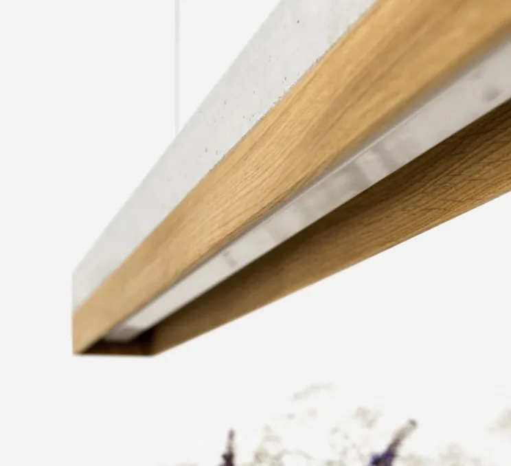 Cette suspension rectangulaire mélange le naturel avec le chêne et l’industriel avec le béton.