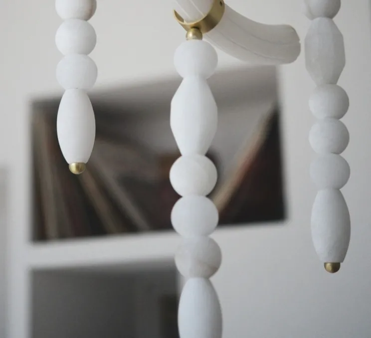 Conçue par Julie Schouvey, cette pièce unique associe un élément en albâtre, sculpté en forme de canne crénelée et inspiré des colonnes antiques, à des perles aux formes variées — rondes, ovales et facettées. Que les suspensions soient installées seules ou en compositions multiples, elles permettent de jouer avec les styles et de créer des scénographies uniques. La lumière traverse délicatement l’albâtre, offrant un éclairage qui peut être intense ou feutré, et qui crée une impression de légèreté remarquable.